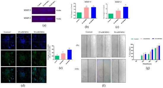 Gelatin zymography of cell supernatant showing the activities of MMP−2 and MMP−9 on days 4, 8, 12, and 16 of MSG stimulation. Band intensities were quantified using ImageJ and graphically plotted. Original gels are presented in Figure S7 (a–c); matrigel invasion assay showing the effect of chronic MSG exposure on the invasiveness of cells and graphical representation of the data (d,e); scratch assay to assess the effect of acute MSG stimulation on the migratory behavior of trophoblast cells and graphical representation of fold differences of the extent of area filled by cells at each time interval (f,g). All data are shown as mean ± standard deviation. Results are representative of at least three independent experiments. * p < 0.05; ** p < 0.01; ns (non-significant).