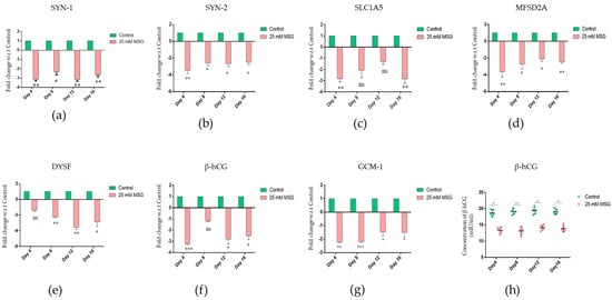 Next, we assessed mRNA expression of differentiation markers in BeWo cells on Day 4, Day 8, Day 12, and Day 16 after chronic stimulation (16 days) by 25 mM MSG by treating cells every alternate day for the entire span of 16 days. Surprisingly, we observed an opposite trend with a significant decrease in the expression of SYN-1, SYN-2, SLC1A5, MFSD2A, DYSF, GCM1, and β-hCG (p < 0.01) (Figure 5a–g). We assessed the expression from conditioned media on days 4, 8, 12, and 16, which showed a significant reduction (Figure 5h).
