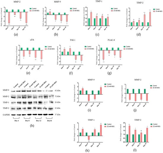 Effects of chronic stimulation of MSG on invasive and migratory properties of HTR-8/SVneo cells. qPCR showing the change in mRNA expression MMP-2, MMP-9, TIMP-1, TIMP-2, UPA, PAI, and PLAC-8, in cells treated with 25 mM MSG for 16 consecutive days. The results were analyzed by the 2−ΔΔC.T method (ΔC.T. = C.T. value of sample −ΔC.T. value of internal reference gene) (a–g); Western blots showing the expression MMPs and TIMPs (h); graphical representation of the band intensities normalized with respect to GAPDH expression. Original blots are presented in Figure S6a–e (i–l). All data are shown as mean ± standard deviation. Results are representative of at least three independent experiments. * p < 0.05; ** p < 0.01; *** p < 0.001. ns (non-significant).