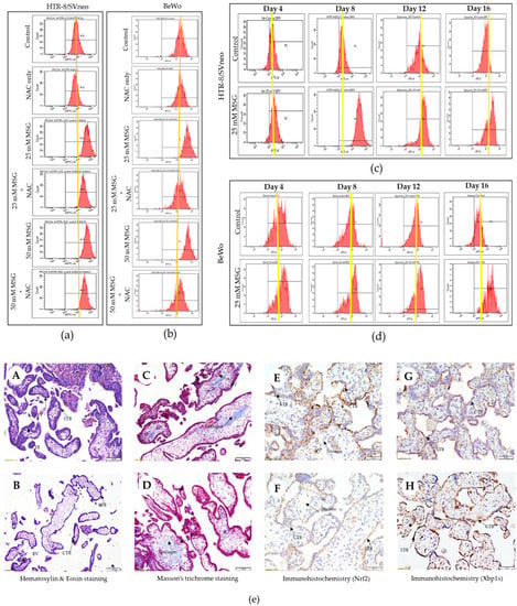 A similar study performed on chronic MSG treatment group revealed a significant upregulation of TBARS on all four days. In HTR-8/SVneo cells, NAC failed to quench TBARS on Day 16. In BeWo cells, a significant decrease in TBARS level was noticed on days 4, 8, 12, and 16 in the group pretreated with NAC after stimulating the cells with 25 mM MSG on every alternate day (Figure 8c,d). An increase in TBARS level was noticed in early placental explants treated with MSG, compared to that in the control group. (Figure 8e). Therefore, we stained the cells with CellRox that showed a right peak shift (increase) in cells treated with MSG in both acute and chronic conditions, as compared to that in the untreated control group. Cells pretreated with 10 mM NAC showed low levels of ROS, similar with those of the control group. The mean fluorescence intensity was measured, and cells pretreated with 10 mM NAC followed by MSG treatment showed no significant change in peak shift as compared to the group treated with MSG only, thereby suggesting that NAC could quench ROS generated in these cells (Figure 9a–d). Similarly, we confirmed the induction of OS by chronic stimulation of MSG in the early placental explants by performing an immunohistochemical analysis. In early placental explants treated with 50 mM MSG for 72 h, Nrf2 expression was significantly downregulated, and H-scores of the control and treated groups were 265 ± 16 and 120 ± 22, respectively (Figure 9e). The Western blot analysis showed significant downregulation of Nrf2 expression in both the cell lines treated with 25 mM MSG for 24 h (Figure S3a–f). Taken together, MSG treatment induced OS in trophoblast cells and early placental explants.