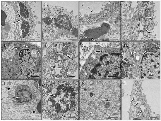 Ultrastructural changes in MSG-treated early placental explants. Transmission electron micrographs showing ultrastructural features in early placental explants. Syncytiotrophoblast in the control (A) and treated groups (B); microvilli (arrows) in the control (C) and treated groups (D); mitochondria in the control (E) and treated group (F); glycogen content (arrows) in the control (G) and treated groups (H); nucleus in the control (I) and treated groups (J); and offer in the control (K) and treated groups (L). Results are representative of at least ten independent experiments.