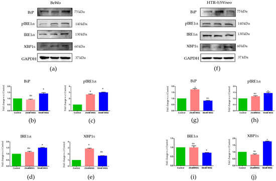 TEM results showed that MSG treatment (50 mM) altered the ultrastructure of mitochondria and ER in the early placental explants. To investigate the role of unfolded protein response (UPR) pathway here, cells were treated with MSG for 24 h. The immunoblot analysis showed a significant upregulation of BiP in BeWo cells after 50 mM MSG treatment (Figure 11a,b). In HTR-8/SVneo cells, a significant upregulation of BiP was noticed by 25 mM MSG treatment (Figure 11f,g). In BeWo cells, phosphorylated IRE1α (pIRE1α) was significantly upregulated by 25 and 50 mM MSG treatment (Figure 11a,c); whereas, in HTR-8/SVneo cells, pIRE1α was significantly upregulated with 50 mM MSG treatment (Figure 11f,h). IRE1α expression was also significantly upregulated in BeWo cells treated with 50 mM MSG (Figure 11a,d); however, a significant downregulation was noticed in HTR-8/SVneo cells. MSG (25 mM) did not induce any significant change in IRE1α levels (Figure 11f,i). Xbp1 was significantly upregulated in BeWo cells treated with 25 mM MSG (Figure 11a,e) and in HTR-8/SVneo cells treated with 50 mM MSG (Figure 11f,j). We also checked Xbp1s expression in early placental explant tissues. Immunohistochemical analysis showed significant upregulation of Xbp1s in the MSG-treated group (H-score: 184 ± 22) compared to that in the untreated early villi explant group (H-score: 109 ± 18) (Figure 9e,g,h). These results suggest that OS caused by MSG treatment may induce ER stress in trophoblast cells.