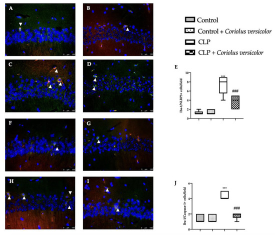 To evaluate the neuroinflammation CLP induced, Western blot analyses were conducted. Increased expression of TLR4 (Figure 8A) and nitric oxide synthase (nNOS) (Figure 8B) were found in tissues harvested from the CLP group, as compared to the Control and Control + Coriolus versicolor groups. Tissues harvested from CLP + Coriolus versicolor group showed reduced TLR4 (Figure 8A) and nNOS (Figure 8B). CLP also increased the expression of the NLR family pyrin domain containing 3 (NLRP3) inflammasome components: NLRP3 (Figure 8C), apoptosis-associated speck-like protein containing a CARD (ASC) (Figure 8D), and Caspase-1 (Figure 8E), as compared to the Control and Control + Coriolus versicolor groups. Coriolus versicolor administration strongly reduced NLRP3 (Figure 8C), ASC (Figure 8D), and Caspase-1 (Figure 8E) expression, as compared to CLP. Immunohistochemical analysis confirmed the increased expression of NLRP3 and Caspase-1 in the CLP group (Figure 9C, Figure 9D, Figure 9H, and Figure 9J, respectively), as compared to the Control (Figure 9A,F) and Control + Coriolus versicolor groups (Figure 9B,G). Well in line with the Western blot results, the CLP + Coriolus versicolor group showed reduced NLRP3 (Figure 9D) and Caspase-1 (Figure 9I) expression, as compared to CLP. Indeed, fluorescent-double-staining showed an increased number of GFAP/NLRP3 and GFAP/Caspase-1-positive cells in samples harvested from the CLP group (Figure 10C,E,H,J), as compared to the samples harvested from the Control (Figure 10A,E,F,J) and Control + Coriolus versicolor (Figure 10B,E,G,J) groups. CLP + Coriolus versicolor group showed a reduced number of GFAP/NLRP3 (Figure 10D,E) and GFAP/Caspase-1 (Figure 10I,J) positive cells. Additionally, the CLP group showed an increased number of Iba-1/NLRP3 (Figure 11C,E) and Iba-1/Caspase-1 (Figure 11H,J) positive cells as compared to controls (Figure 11A,B,E–G,J).