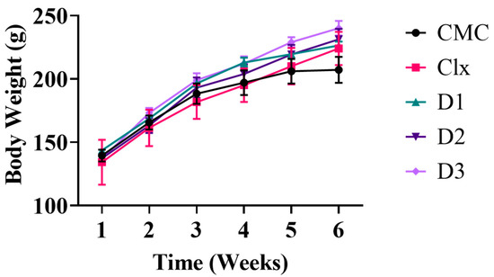 The toxicity responses resulting from animals can be decisive in judging the safety of chemical compounds if they are found to have potential pharmacological effects. In our study, all rats were observed daily after treatment by compounds under test for the presence of any signs of toxicity. The body weight of each rat was recorded once weekly for 6 weeks until the end of the experiment. No mortality was observed during the experimental period, and all the treated rats survived the 6 weeks of the experiment. During the observation, no toxic signs were obvious on the rats’ vitals. The compounds did not produce any adverse toxic effect on the body weight changes, such that all animals exhibited a normal increase in body weight without any noticeable difference between both the control and treated groups (Figure 1).