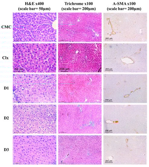 The up-regulation of α-SMA is a fundamental step that goes in parallel with HSC activation and liver fibrosis [75]. In fact, the regression of fibrosis is characterized by a decline in the fibrosis score and α-SMA. Additionally, ALT and AST are hepatic-enzyme indicators of liver injury. When damage happens to hepatocytes, ALT and AST were upraised in the bloodstream before the occurrence of clinical signs and symptoms of liver diseases [76,77].