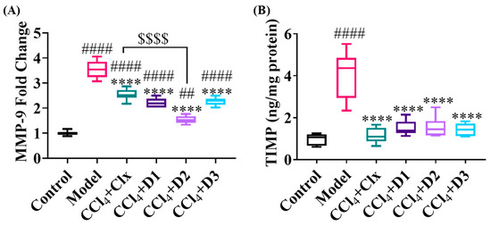 Effect of treatment with various derivatives after CCl4 fibrosis induction on ECM remodeling. (A) Hepatic mRNA expression of MMP-9 (fold change) and (B) hepatic TIMP-1 protein expression level (ng/mg protein). Data shown are expressed from minimum to maximum as box and whiskers; n = 6. ## p < 0.01, and #### p < 0.0001 compared to control. **** p < 0.0001 compared to model. $$$$ p < 0.0001 compared to CCl4 + Clx.