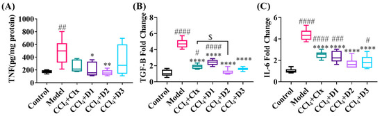 Proinflammatory and profibrogenic cytokines level of expression through fibrosis and after treatment. (A) Hepatic TNF-α protein expression level (pg/mg protein), (B) hepatic mRNA expression of TGF-β (fold change), and (C) hepatic mRNA expression of IL-6 (fold change). Data shown are expressed from minimum to maximum as box and whiskers; n = 6. # p < 0.05, ## p < 0.01, ### p < 0.001, and #### p < 0.0001 compared to control. * p < 0.05, ** p < 0.01, and **** p < 0.0001 compared to model. $ p < 0.05 compared to CCl4 + Clx.