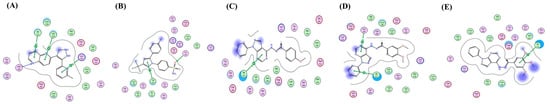 Engagement of Clx and D1-3 in some binding patterns with the TGF-β type 1 receptor active site such as those exhibited by the co-crystallized ligand. (A) The co-crystallized ligand, (B) Clx, (C) D1, (D) D2, and (E) D3.