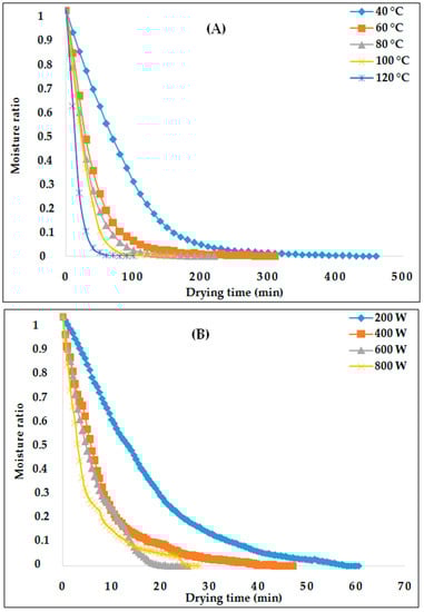 As it was expected, microwave powers had a high impact on the moisture ratio (MR) transformation of the PP samples, which were dried faster than those that underwent convective drying. Thus, the necessary times for CD to have weight stability at different temperatures were 450 ± 10, 303.33 ± 5.77, 166.67 ± 5.77, 160 ± 0, and 96.67 ± 5.75 min for 40, 60, 80, 100, and 120 °C, respectively. However, the time for different microwave powers, i.e., 200, 400, 600, and 800 W, was much lower at 60.0 ± 0.5, 40.0 ± 6.4, 23.17 ± 2.02, and 25.17 ± 4.07 min, respectively. This is consistent with what M’hiri et al. [33] observed when using microwave to dry lemon by-product. Their kinetics indicated a significant decrease in drying time when power rose from 90 to 350 W. Accordingly, the drying time found for 350 W was 3.80 times lower than that found for 90 W. Darvishi et al. [34] explained this phenomenon as a sudden mass transference inside a product when the power heat is greater since it generates more heat in the product, causing a significant steam force disparity between the core and the exterior of the sample owing to the featured microwave’s volumetric hotness.