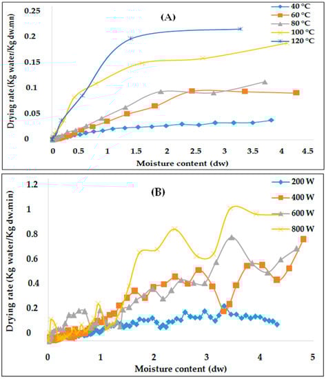 Fluctuations of drying rate versus moisture content using (A) convective drying and (B) microwave drying. The various temperatures adopted in the convection drying (CD) are 40, 60, 80, 100, and 120 °C, and the powers used in the microwave drying (MD) are 200, 400, 600, and 800 W.