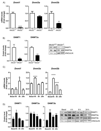 NRF2 promotes the expression of DNMT1 and DNMT3b. (A) qPCR measurement of the levels of Dnmt1, Dnmt3a, and Dnmt3b mRNAs in Nfe2l2+/+ and Nfe2l2−/− MEFs. n = 3−4 samples ± SEM. (B) The protein levels of DNMT1, DNMT3a, and DNMT3b were analyzed via immunoblotting and quantification based on densitometry using the same samples as in (A). n = 3−4 samples per experimental group ± SEM. Asterisks denote significant differences: * p < 0.05, ** p < 0.01, and **** p < 0.0001, comparing the indicated group with the wild-type mice according to a Student’s t-test. Time-course analysis of treatment of hippocampal HT22 cells with DMF (20 μM). (C) RT-qPCR analysis of the levels of Dnmt1, Dnmt3a, and Dnmt3b mRNAs. n = 4−5 samples ± SEM. (D) Protein levels of DNMT1, DNMT3a, and DNMT3b were analyzed via immunoblotting and respective quantification based on densitometry. n = 3−4 samples per experimental group ± SEM. The one-way ANOVA test with a Newman–Keuls posterior test was used to evaluate differences in significance between groups: ** p < 0.01 compared to basal levels.