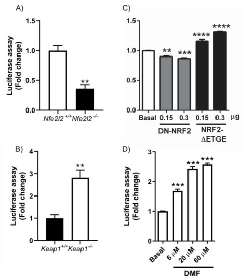 Function of the 3’UTR-Nfe2l2 via luciferase reporter analysis. The potential ability of miRNAs or other factors to regulate the 3’ untranslated region (3’UTR) of Nfe2l2 mRNA was evaluated using a luciferase reporter. (A) Nfe2l2+/+ and Nfe2l2−/− MEFs cells and (B) Keap1−/− and Keap1+/+ MEF cells were transfected with pSGG-NRF2-3’UTR. (C) HT22 cells were transfected with pSGG-NRF2-3’UTR, pEF-ΔNRF2(DN), or pcDNA3.1/V5HisB-mNRF2ΔETGE, respectively. Asterisks denote significant differences: ** p < 0.01, *** p < 0.001 and **** p < 0.0001, comparing the indicated group with the control group according to a Student’s t-test. (D) HT22 cells were transfected with pSGG-NRF2-3’UTR and treated with DMF at 6 μM, 20 μM, or 60 μM for 16h. All luciferase activities were measured 24 h after transfection. The luciferase activities were normalized to the renilla luciferase activities from the co-transfected reporter. The relative luciferase activities were calculated by normalizing them to those of controls. n = 3 samples per experimental group ± SEM. The one-way ANOVA test with a Newman–Keuls posterior test was used to evaluate differences in significance between groups: ** p < 0.01 and *** p < 0.001 compared to basal levels.