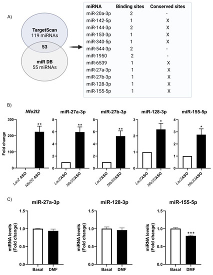 Association of miR-27a-3p, miR-27b-3p, miR-128-3p and miR-155-5p with Nfe2l2 mRNA and possible role of NRF2 mRNA in TDMD of miR-155-5p. (A) Study design. Of the 53 miRNAs common between both databases, we examined which ones contained either two binding sites or conserved sites or both. These 12 miRNAs were further analyzed. (B) Biotinylated antisense oligomers (ASOs) complementary to the Nfe2l2 mRNA and LacZ were incubated with HT22 lysates. After affinity pulldown using streptavidin beads, the levels of miRNA enrichment in the ASO-pulldown samples were assessed via RT-qPCR analysis, and only miR-27a-3p, miR-27b-3p, miR-128-3p, and miR-155-5p were enriched (relative to the enrichment of Gapdh mRNA, a transcript that does not bind the ASOs and encodes a housekeeping protein) in the pulldown samples. (C) HT22 cells were treated with DMF (20 μM) for 16 h, and miRNA levels were measured via qPCR analysis. Asterisks denote a significant difference: * p < 0.05, ** p < 0.01, and *** p < 0.001 compared to the corresponding control group according to a Student’s t-test.