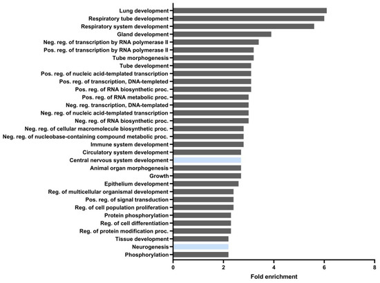 As mentioned above, miRNAs control target gene expression by inhibiting translation and degrading target RNAs. In addition, there is evidence that mRNAs can affect microRNA activity in two manners [42]. First, some mRNAs can function as competing endogenous RNAs (ceRNAs), as seen when two endogenous targets compete with each other for binding to a shared miRNA [43]. In this case, if one of the endogenous mRNA targets changes its expression, the activity of miRNAs upon the other targets will change accordingly. This mechanism appears to have been ruled out, since NRF2 overexpression itself reduced the levels of the miRNAs that bind to it. The second mechanism is target-directed miRNA degradation (TDMD) [44]. In TDMD, the target mRNA promotes the degradation of the miRNA that binds to it [45]. To test whether this might be what was happening with NRF2, we treated HT22 cells with DMF (conditions similar to Figure 4D, 20 μM) and analyzed the expression levels of miR-27a-3p, miR-128-3p, and miR-155-5p. As observed in Figure 5C, NRF2 induction promoted a significant decrease in miR-155-5p levels, while other miRNAs were unchanged. Finally, we sought to determine in which biological processes miR-155-5p is involved, mainly at the neuronal level, in order to determine the role that its modulation through NRF2 may have. To do this, we determined its targets through the TargetScan database, and using the ShinyGo 0.76.2 platform and its pathway database, we performed a GO biological process analysis. Although miR-155-5p participates in many processes, it was found to be involved in the regulation of ~45 mRNAs encoding proteins that participate in the development of the central nervous system (CNS) and ~64 mRNAs encoding proteins implicated in neurogenesis (Figure 6), respectively. Thus, a more exhaustive analysis of the involvement of miR-155-5p and the possible regulation by NRF2 in the development of the central nervous system is required.