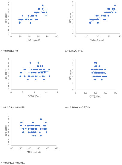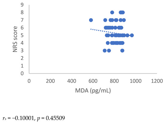Spearman’s correlation between numerical rating Scale (NRS) score and mediators of inflammation or oxidative stress in the post-mastectomy (PMP) group 3 months after surgery. NRS = Numerical Rating Scale; CRP = C-reactive protein; IL-6 = Interleukin 6; IL-8 = Interleukin 8; TNF-α = Tumor necrosis factor-α; SOD = Superoxide dismutase; CAT = catalase; MDA = Malondialdehyde.