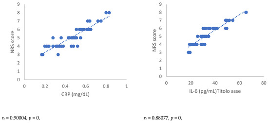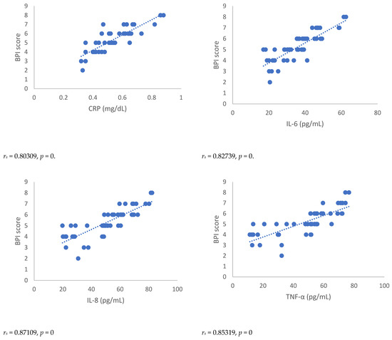 Spearman’s correlation, performed between NRSs or BPI score and mediators of inflammation, showed a statistically significant correlation between NRSs or BPI score and mediators of inflammation both 3 and 6 months after surgery (Figure 1, Figure 2, Figure 3 and Figure 4). Moreover, results showed a negative Spearman’s correlation between IPAQ score and mediators of inflammation (Figure 5 and Figure 6) and between IPAQ and NRS and BPI scores (Figure 7) either at 3 or 6 months after surgery. No correlation between biomarkers of oxidative stress and NRS or BPI or IPAQ scores was detected either 3 or 6 months after surgery (Figure 1, Figure 2, Figure 3 and Figure 4).