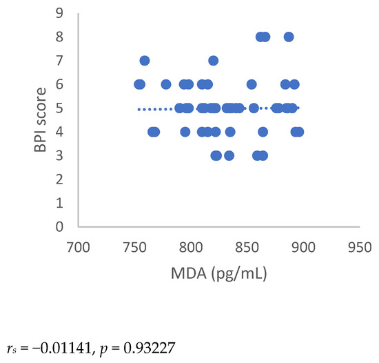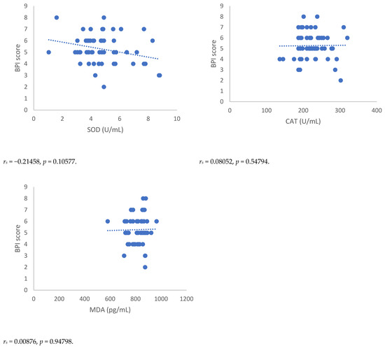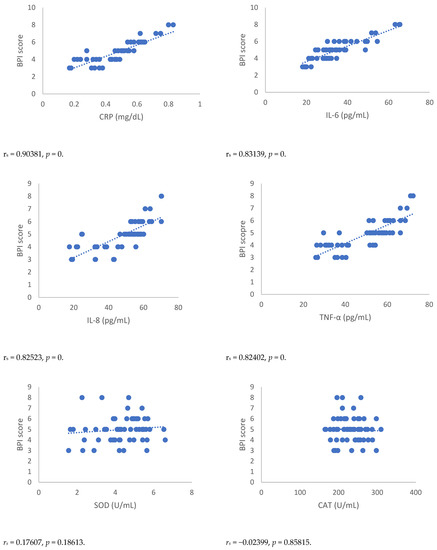 Sperman’s correlation between BPI (Brief Pain Inventory) score and mediators of inflammation or oxidative stress in the post-mastectomy (PMP) group 6 months after surgery. BPI = Brief Pain Inventory; CRP = C-reactive protein; IL-6 = Interleukin 6; IL-8 = Interleukin 8; TNF-α = Tumor necrosis factor-α; SOD = Superoxide dismutase; CAT = catalase; MDA = Malondialdehyde.