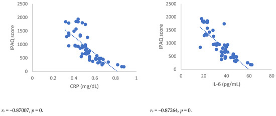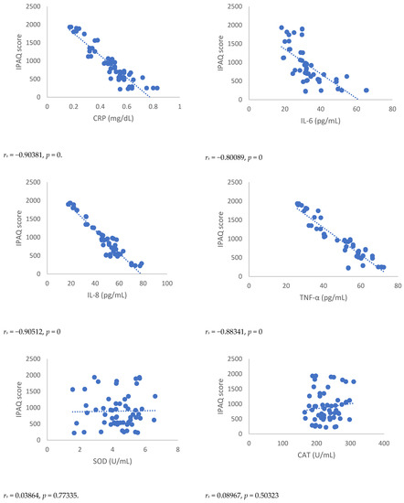 Sperman’s correlation between IPAQ (International Physical Activity Questionnaire) score and mediators of inflammation or oxidative stress in post-mastectomy (PMP) group 6 months after surgery. IPAQ = International Physical Activity Questionnaire; CRP = C-reactive protein; IL-6 = Interleukin 6; IL-8 = Interleukin 8; TNF-α = Tumor necrosis factor-α; SOD = Superoxide dismutase; CAT = catalase; MDA = Malondialdehyde.