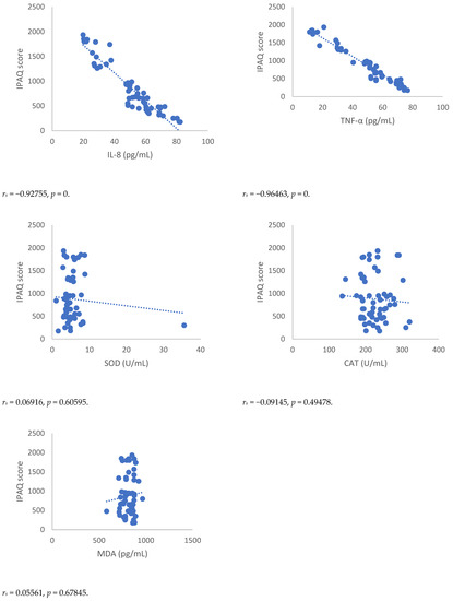 Sperman’s correlation between the IPAQ (International Physical Activity Questionnaire) score and mediators of inflammation or oxidative stress in the post-mastectomy (PMP) group 3 months after surgery. IPAQ = International Physical Activity Questionnaire; CRP = C-reactive protein; IL-6 = Interleukin 6; IL-8 = Interleukin 8; TNF-α = Tumor necrosis factor-α; SOD = Superoxide dismutase; CAT = catalase; MDA = Malondialdehyde.