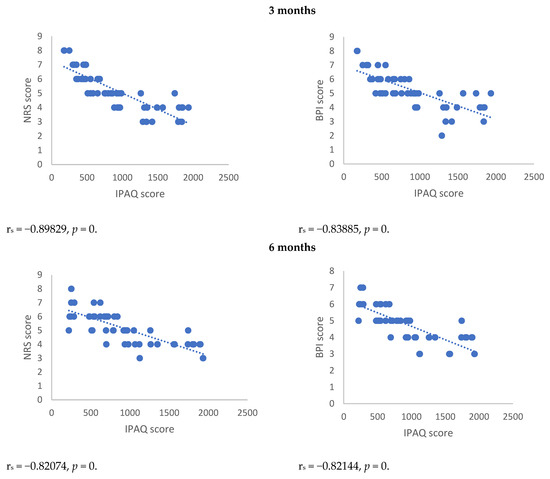 Spearman’s correlation between IPAQ/NRS and IPAQ/BPI in the post-mastectomy (PMP) group 3 and 6 months after surgery. IPAQ = International Physical Activity Questionnaire; NRS = Numerical Rating Scale; BPI = Brief Inventory Pain.