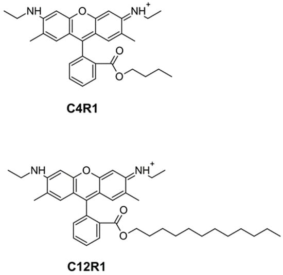 Chemical structure of C4R1 (butyl ester of rhodamine 19) and C12R1 (dodecyl ester of rhodamine 19).