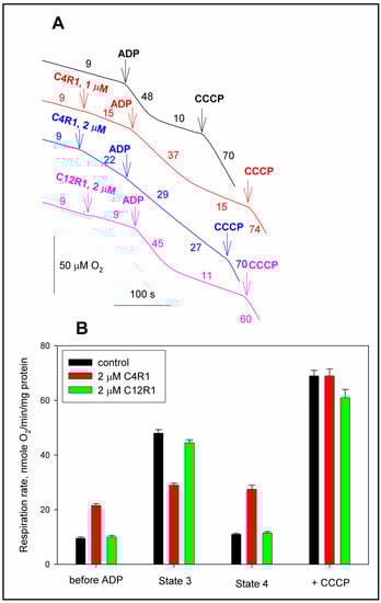 Figure 2A shows that C4R1 used in concentration 1–2 µM activates state 4. On the other hand, the effect on initial respiration of its more hydrophobic analogue C12R1 used in the same concentrations was negligible while demonstrating a slightly diminished respiration rate at state 3. This data correlates with the previously shown one that the short-chain derivative of rhodamine 19 (C4R1) in the same concentrations as C12R1 causes a faster and more significant drop in the transmembrane potential of mitochondria [28].