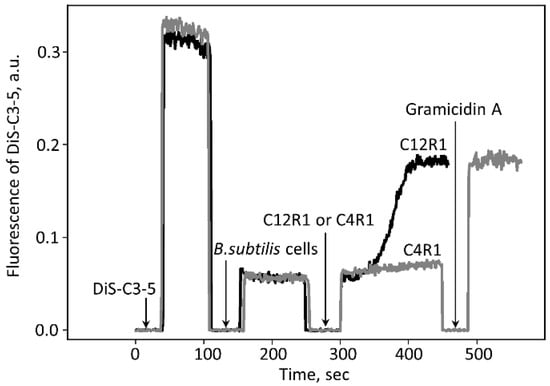 Changes in the electric potential across the membrane of B. subtilis. Changes in the membrane potential were monitored by measuring fluorescence of DiS-C3-(5) (10 μM) in PBS buffer. The short time intervals with the fluorescence falling to zero are caused by the opening of the chamber for making additions. C4R1 (0.6 µM) and C12R1 (0.6 µM) were added as shown. Gramicidin A (0.5 ng/mL) was added at the end of the experiment for perforation of the cell membrane to collapse the membrane potential.