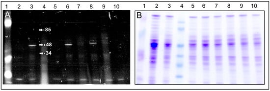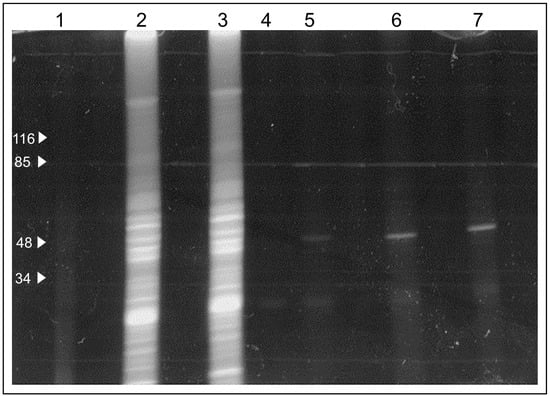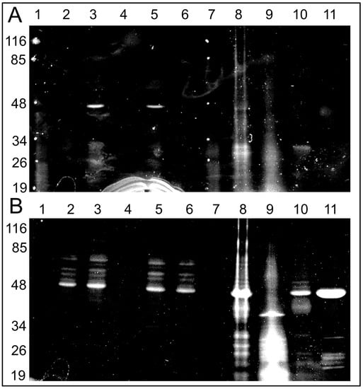 The protein extracts were fractionated by two-dimensional electrophoresis according to [45]. IEF was performed in glass tubes (2.4 × 180 mm) filled with 4% PAAG prepared in a 9 M urea solution containing 2% TritonX-100 and a 2% mixture of ampholines with pH 5–7 and pH 3.5–10 were used at a ratio of 4:1. The protein extracts (100–150 μL) were applied to the “acid border” of each gel column, and IEF was performed for 3 h at 1400 V/h (Model 175; Bio-Rad, Hercules, CA, USA). The fractionation in the second direction (SDS slab gel electrophoresis with the acrylamide concentration gradient 5–20%) was performed, as previously described [46].