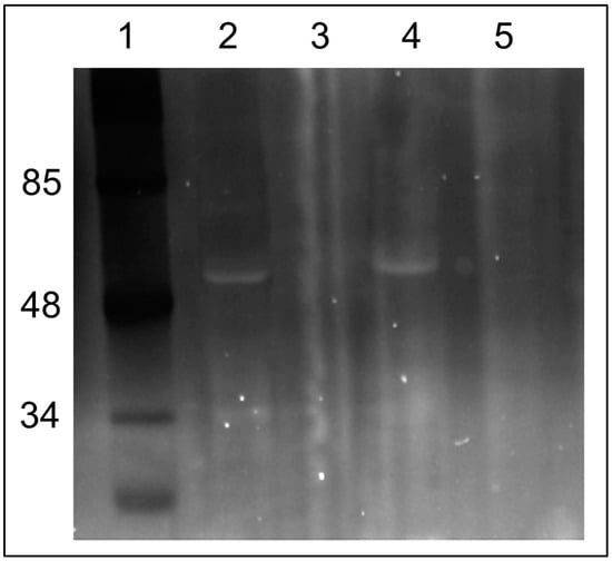 Fluorescent image of the gel after SDS electrophoresis of solubilized rat liver mitochondria (RLM) or extracts of B. subtilis exposed to C4R1 (5 µM). Lanes: 1. MW markers; 2. RLM+C4R1; 3. Blank well; 4. RLM+C4R1; 5. B. subtilis+C4R1. Note the fluorescing band in RLM extracts at around 50 kDa.
