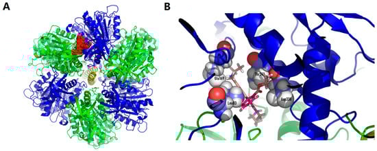 Rhodamine 6G docked structures on human ATP synthase. (A), whole ATPase complex overview (green, α-subunits of ATP synthase; blue, β-subunits of ATP synthase; red, rhodamine 6G). (B), binding pocket close up look with amino acid residues (L83, E169, D338, T341) involved in binding to rhodamine molecule. While searching for the binding site during docking from several locations, the equally optimal location for the ligand was found. The estimated binding energy was estimated by the Autodock vina program at 8.3 kcal/mol.