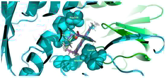 C4R1 docked structures on human ATP synthase. The conditions are the same as in Figure 8 except that the α-subunit of ATP synthase is shown in turquoise and β-subunit of ATP is in light green. C4R1 molecule is locked in the center of the figure entrapped in the same pocket as for C2R1 organized by the same amino acid residues (L83, E169, D338, T341).