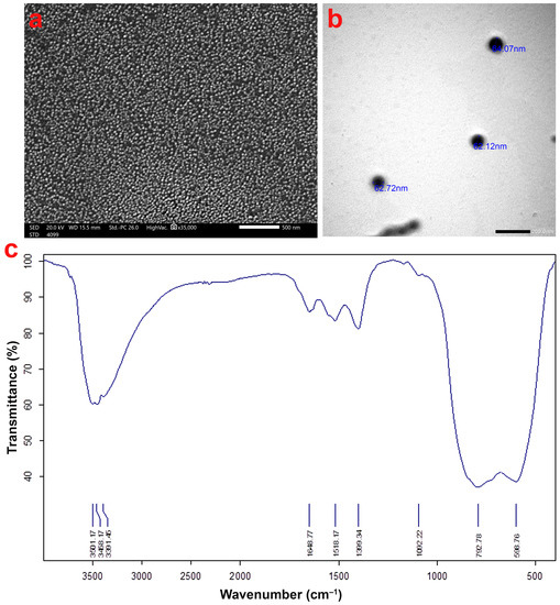 Characterization of Al2O3 NPs via SEM images (a), TEM images (b), and an FT-IR spectrum (c), validating the size of the nanoparticles used in this study, which is in agreement with the certificate provided by the manufacturer.