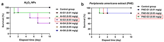 Mortality analyses for different groups of male locusts after injection with a single dose of either (a) Al2O3 NPs or (b) PAE in a dose-dependent manner after monitoring for 10 days. For the Al2O3 NPs treatment, six groups of male locusts along with the control group (10 insects/group) were established and injected with the nanoparticles at different doses of 0.01, 0.02, 0.03, 0.04, 0.05, and 0.06 mg/g body weight, respectively, and the Chi square was 12.43 with a p < 0.05. For PAE, three groups of male locusts along with the control group (10 insects/group) were established and injected with the extract at different concentrations of 0.01, 0.03, and 0.05 mg/g body weight, respectively, and the Chi square was 1.090 with a non-significant difference between groups. The red rectangle points to the doses selected to treat the male locusts for further investigations in the case of Al2O3 NPs and PAE.