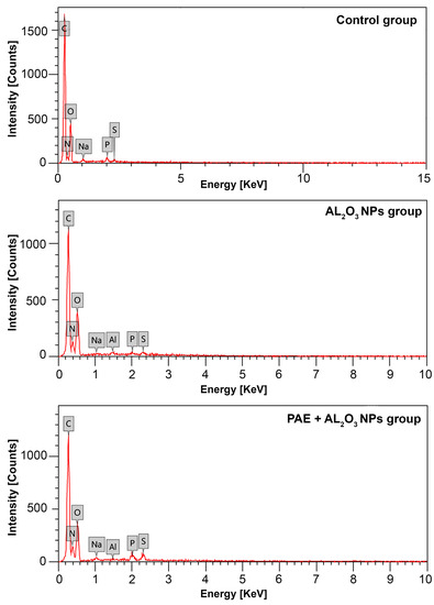 EDX examination of the testicular tissues harvested from the control group of locusts revealed the incidence of C, N, O, Na, P, and S, while the locust group exposed to Al2O3 NPs demonstrated the agglomeration of Al in addition to the previous elements. The pretreatment of locusts with PAE resulted in a significant lessening of the Al accumulated in the testes. This is likely related to the chelating activity of PAE, due to the presence of several compounds with high antioxidant features along with chelation properties in relation to the nanoparticles [20].