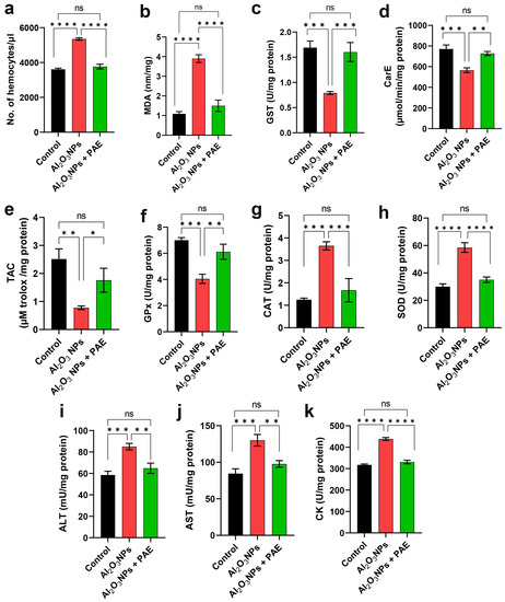 Biochemical analyses of testicular tissues after Al2O3 NPs injection in L. migratoria with or without PAE treatment. (a) Hemocytes total count, (b) malondialdehyde quantification by mg of testicular tissue, (c) glutathione S-transferase, (d) activity of the carboxylesterase E, (e) total antioxidant capacity, (f) glutathione peroxidase activity, (g) catalase activity, (h) superoxide dismutase level, (i) alanine transferase activity, (j) aspartate transferase activity, and (k) creatine kinase activity. All investigations were replicated at least three times and data are shown as mean ± SD. Data were analyzed with one-way ANOVA, followed by Tukey’s test for multiple comparisons. Different letters indicate significant differences between groups (**** p < 0.0001, *** p < 0.001, ** p < 0.01, * p < 0.05, and (ns) indicates a non-significant difference).