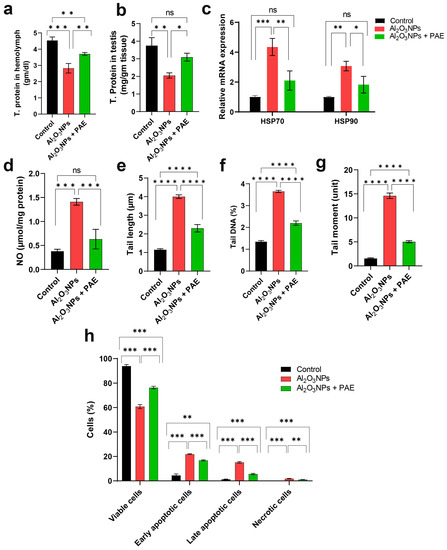 Total protein concentrations in (a) hemolymph and (b) testis, (c) relative expressions of HSP70 and HSP90 mRNA, and (d) nitric oxide were evaluated to determine the harmful effects induced in the testis by Al2O3 NPs injection in L. migratoria with or without PAE treatment. (e) Comet assay of DNA in cells extracted from testes, (f) tail length, DNA percentage in the comet tail, (g) tail moment, and (h) Annexin-V/PI assay results were also assessed. All investigations were replicated at least three times and data are shown as mean ± SD. For the comet assay, 50 to 100 randomly selected cells per slide were used. Data were analyzed with one-way ANOVA, followed by Tukey’s test for multiple comparisons. Different letters indicate significant differences between groups (**** p < 0.0001, *** p < 0.001, ** p < 0.01, * p < 0.05, and (ns) indicates a non-significant difference).