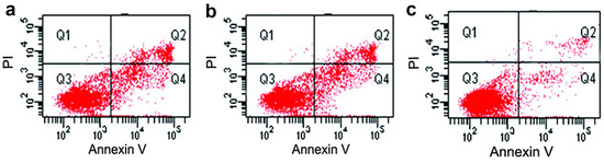 Flow cytometric analyses utilizing Annexin-V-FITC of (a) control locusts, (b) Al2O3 NPs-treated locusts, and (c) locusts treated with PAE + Al2O3 NPs. Q1, Q2, Q3, and Q4 signify necrotic cells, late apoptotic cells, viable cells, and early apoptotic cells, respectively.