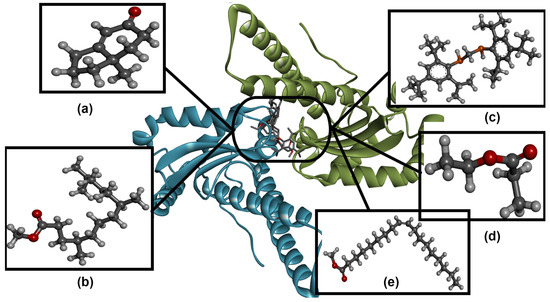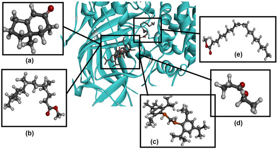 Based on the findings of a previous study [20], some PAE compounds were chosen for molecular docking analysis in order to predict the antioxidant capacity implicated in our studied extract. The compounds, 7a-Methyl-1,2,3,6,7,7a-hexahydro-5H-inden-5-one (MHI), Methyl 4,8,12-trimethyltridecanoate (MTTD), Methylenebis (2,4,6triisopropylphenylphosphine) (MTP), Propanoic acid-ethyl ester (PAE) and oleic acid- methyl ester (OAM) were subjected to molecular docking analysis using two crystal macromolecular structures and 1AR5 and 8CAT targets to probe the antioxidant activity of these ligands. In the current study, a molecular docking simulation analysis was accomplished using Autodock software (version 4.2) (accessed on 1 December 2022) with the preparation of binding sites, then several energetic conformations’ production. The Discovery Studio program (https://www.3ds.com/products-services/biovia/) (accessed on 1 December 2022) was used for some visualization. The crystal macromolecular target proteins used in this study were downloaded from the protein data bank (https://www.rcsb.org/) (accessed on 1 December 2022). Grid parameters were located with box dimensions 60 × 44 × 56 Ǻ3 for 1AR5 and 62 × 54 × 60 Ǻ3 for 8CAT; the specified spaces included a large number of active macromolecular amino acid sites for best conformation prediction.