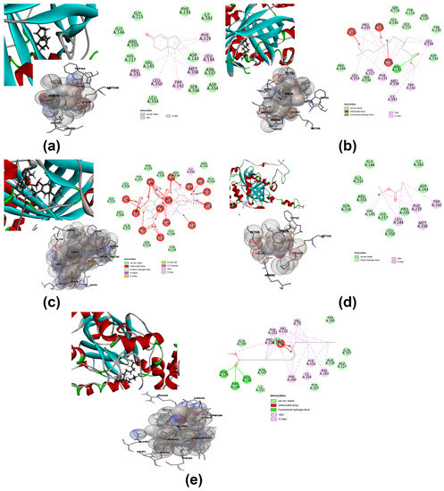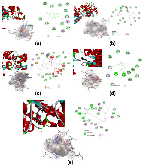 To rationalize the previous experimental activities as antioxidant behaviors, molecular docking data analysis predicted the inhibition of protein active sites. The best conformers and protein–ligand binding states generated from docking are ranked with higher (with negative values) binding energies. Table 2 presents the ligands with binding energy (Ebinding) and intermolecular energy (EIntermol.) values, where the more negative values of binding energy explain the stability of the protein–ligand complex. According to the investigated energy parameters, related to binding energy, it was predicted that MHI is more stable (−5.79 kcal/mol) in complexing with the target protein 1AR5, and also forms a more stable complex (−6.03 kcal/mol) with the target protein 8CAT. This may be attributed to the heterocyclic rings that strongly interact with amino acids independent of their number and type of interaction. As regards other intermolecular interactions, MTTD manifested several interaction types with 1AR5 (−8.24 kcal/mol), while in 8CAT, one type of unfavorable interaction destabilized the ligand–protein complex (12.56 kcal/mol). In both target proteins, MTP yielded a highly unstable bio-complex due to the large steric hindrance and unfavorable bumps that were formed. PAE and OAM with 1AR5 showed a similar binding-stabilization effect (−3.79 and −3.73 kcal/mol, respectively), with larger interaction types in only OAM (−8.56 kcal/mol), while for 8CAT, the protein–PAE complex was found to be more stable than OAM. Based on the data resulting from docking with the two target proteins 1AR5 and 8CAT, the five ligands with a successful pose score interacted with several amino acids. Figure 7 and Figure 8 show the best docking scores at the same protein active sites, with some differences in the mode of interaction. Due to the large variety of structural functional bio-species, Figure 9 and Figure 10 show several non-covalent interaction types present between the bio-macromolecule and the studied ligands, such as Van der Waals, alkyl, π-alkyl, conventional hydrogen and carbon–hydrogen bonds, and the π-donor hydrogen bond. Large unfavorable bumps are distributed in the protein–MTP complex (Figure 8c and Figure 10c), and are also slightly present in the 8CAT-MTTD complex (Figure 10b).