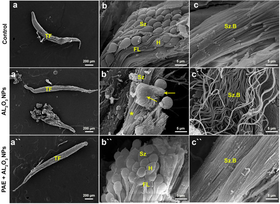Scan electron micrographs of the Al2O3 NPs-injected locusts reveal anomalies in the morphology of the testicular tissues, with remarkable impairment in the testicular follicle (TF). Additionally, Al2O3 NPs exposure resulted in significant diminutions in the TF width compared to the control and pre-treated with PAE tissues (Figure 11a, a` and a``). Moreover, abnormalities in spermatozoa (Sz) heads and flagella structures were observed in the Al2O3 NPs-injected insects compared with the control group and the locusts pre-administered with PAE (Figure 11b–b``). The spermatozoa of locusts exposed only to Al2O3 NPs emerged with abnormal morphologies, with double-head spermatids and spermatids agglutinated tail-to-tail (Figure 11b`), whereas those from locusts exposed to PAE + Al2O3 NPs had regular morphological structures and a long flagellum without any abnormalities (Figure 11b``). The spermatozoa bundles in the Al2O3 NPs-injected locusts appeared with an irregular arrangement compared to the control insects (Figure 11c,c`). It is evident that the spermatozoa bundles in the PAE-treated locusts emerged with regular arrangements similar to those in the control group, and exhibited no signs of agglutinations or structural abnormalities, as illustrated in Figure 11c``. Overall, these findings suggest that PAE may be useful in preventing the testicular structural anomalies caused by Al2O3 NPs.