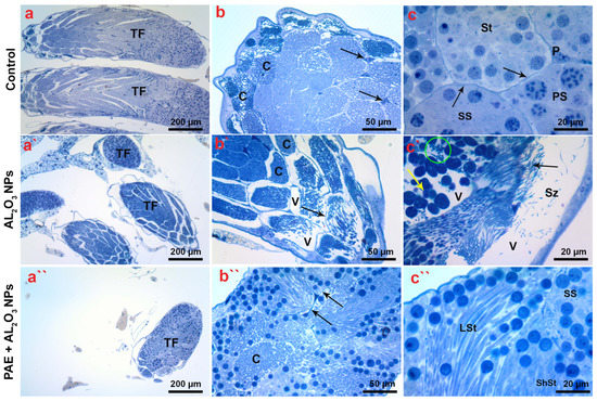 Histological analysis of the TF of locusts treated with Al2O3 NPs has shown severe morphological and structural aberrations, including remarkable shrinkage in TF size compared to the control insects (Figure 12a–a``). Typical cysts within the TFs and parietal cells in between were discerned in the control and the PAE + Al2O3 NPs-treated groups. By contrast, ruptured cyst walls and numerous vacuolations within cysts were observed in Al2O3 NPs-treated locusts, which could not be detected in the controls or the insects treated with PAE + Al2O3 NPs (Figure 12b–b``).