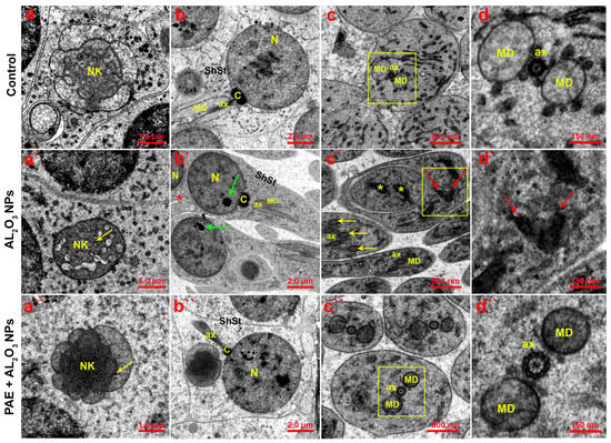 Ultrastructural analysis of the locust testis using TEM after Al2O3 NPs injection with or without PAE treatment. Electron micrographs in Figures (a–a``) reveal the difference in the structure of the mitochondrial nebenkern (NK) associated with the early spermatid stage in the control group, the Al2O3 NPs-treated group, and the PAE + Al2O3 NPs-treated group, respectively. Figure (a) shows the typical structure of NK characteristics for L. migratoria. Figure (a`) depicts the NK alterations as disintegrated NK with many vacuoles containing nanoparticles (arrow) in locust follicular cysts exposed only to Al2O3 NPs. Figure (a``) demonstrates the normal integration of the NK similar to that of the control group even with the accumulation of Al2O3 NPs within it (arrow). Electron micrographs in Figures (b–b``) show the short spermatid (ShSt) stage in the control group, Al2O3 NPs-treated group, and PAE + Al2O3 NPs-treated group, respectively. Figure (b) shows the typical structures of the short spermatid (ShSt), nucleus (N), centriole (C), axonemes (ax) and two mitochondrial derivatives (MD). Figure (b`) shows a short spermatid (ShSt) agglutinated head-to-head (*), nuclear dense vesicles of aggregated nanoparticles (arrows) (which could not be assessed with TEM analysis), centriole (C), and nucleus (N). Figure (b``) shows normal short spermatids (ShSt). Figures (c), (c`,c``) show the structural difference of the flagella as a result of exposure to Al2O3 NPs with and without the PAE treatment compared to the control group. Figure (c) shows a typical transverse section across the flagella, with the axoneme (ax) in the middle, surrounded by two mitochondrial derivatives (MD). Compared to the control group, Figure (c`) illustrates the structural anomalies in the flagella, which emerged as degenerated axoneme (ax) (red arrow) and mitochondrial derivatives (MD) (asterisk). Furthermore, agglutination is implied by three axonemes (ax) in the same section (yellow arrow). Figure (c``) shows typical axoneme (ax) and mitochondrial derivatives (MD). Figures (d–d``) depict magnified sections as indicated in the yellow square of the previous figures, exhibiting the structure of normal axonemes (ax) in Figures (d,d``), while degenerated axonemes (red arrows) could be observed in locusts treated only with Al2O3 NPs.