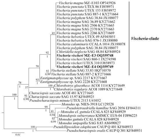 The 18S rDNA phylogenetic tree was constructed with 35 nucleotide sequences of closely related Eustigmatophycean taxa derived from the National Center for Biotechnology Information (NCBI) and the sequences of the novel strains. All Vischeria strains, including MZ–E3 and MZ–E4, form one separate clade (Figure 2). ML and BI analyses gave congruent results for the phylogenetic placement, supported by high statistical values (Figure 2). V. vischeri MZ–E3 and MZ–E4 were most similar to authentic strain Vischeria vischeri SAG 860-1 and V. vischeri UTEX 310.