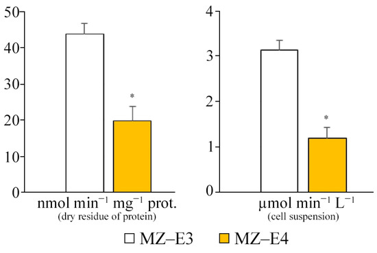 For different strains (MZ–E3, MZ–E4) of the V. vischeri, there is no significant difference in CAT and SOD activity in terms of protein dry residue (Figure 4). At the same time, the MZ–E4 strain has 2.94 times higher GPO activity. When calculating the activity per unit volume of biomass, there was also a significantly higher GPO activity by 2.49 times and a reduced SOD activity by 1.55 times for MZ–E4 relative to MZ–E3.