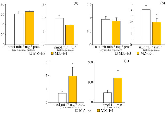 Antioxidant enzyme activity on the dry residue of protein and cell suspension of Vischeria vischeri strains (MZ–E3; MZ–E4). (a) CAT activity. (b) SOD activity. (c) GPO activity. Medium: BBM; culture volume: 250 mL; incubation time: 25 days; M ± S.E., n = 3; * the differences are significant relative to MZ–E3 (p ≤ 0.05).