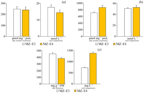 The carotenoid content in the dry residue of the MZ–E3 strain was set at 19.2 ± 7.50 mg g−1 DW, which is 2.1 times higher than the corresponding indicator in MZ–E4. When calculating the content of carotenoids per unit volume of biomass, this trend persists, but the difference increases to 2.56 times (Figure 7c).