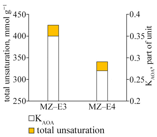 The study of the antioxidant activity index of strains (KAOA) showed that the strain MZ–E3 offers the most significant test resistance to lipid peroxidation. Its coefficient value is 1.3 times higher than MZ–E4 (Figure 6). The resistance to lipid peroxidation is also determined by the unsaturation of the FAs that form them since it is UFAs that are the main substrate of lipid peroxidation. The unsaturation of lipids of the strain MZ–E3 was found to be 1.25 times higher than the corresponding indicator MZ–E4.