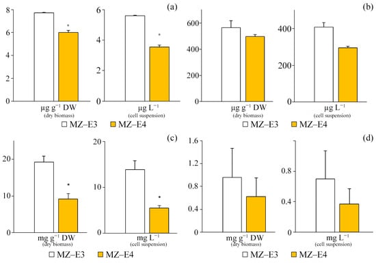 Chlorophyll and secondary metabolites are in the dry biomass and cell suspension of Vischeria vischeri strains (MZ–E3; MZ–E4). (a) Retinol. (b) α-tocopherol. (c) Carotenoids. (d) Chlorophyll a. Medium: BBM; culture volume: 250 mL; incubation time: 25 days; M ± S.E., n = 3; * the differences are significant relative to MZ–E3 (p ≤ 0.05).