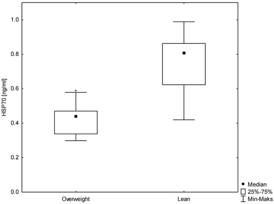 According to the WHO guidelines, the participants were divided into two groups: lean men (n = 30) and men overweight (n = 27). A statistically significant (p < 0.007) difference was observed in the BMI between the studied groups. Highly statistically significant (p < 0.000) differences were demonstrated in HSP70 concentrations (median 0.8 ng/mL for the lean group and 0.4 ng/mL for the group overweight) and in the serum insulin concentrations (6.7 mU/mL for the lean group and 10.0 mU/mL for the group overweight). Moreover, a difference was observed in the HOMA-IR, which was significantly higher in men overweight (median 1.3 mM for the lean group and 2.0 mM for the group overweight, p < 0.0001) (Figure 1, Figure 2 and Figure 3). No differences were found for the other biochemical parameters. These results are summarized in Table 1.