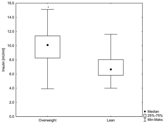 A box-whisker plot for the insulin concentrations in the studied groups. * statistically significant difference at p < 0.05.